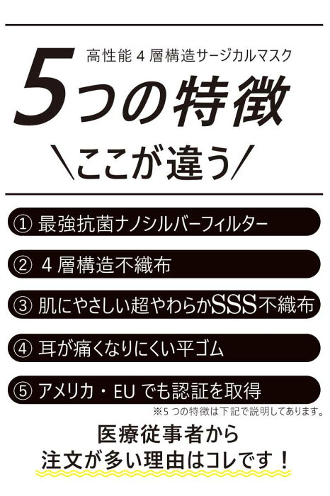 4層 サージカル マスク 医療用 大容量 2500枚 静菌効果が凄い 耳が痛くならない シルバーナノ N95と同等 快適 銀イオン 高性能 送料無料 使い捨て n95 【1箱50枚入×50箱】 四層マスク おすすめ 業務用 FDA CE 認証